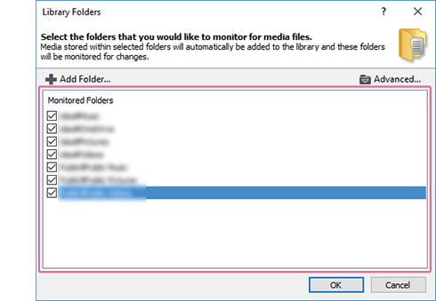 Starten Sie „Media Go“, und wählen Sie dann [Datei] - [Medien zu/aus Bibliothek hinzufügen/entfernen]. Suchen Sie in der Liste von [Überwachte Ordner] den Speicherort der Bibliothek, die Sie importieren möchten. Notieren Sie sich bei Bedarf den Speicherort. Klicken Sie dann auf [OK], und schließen Sie „Media Go“.