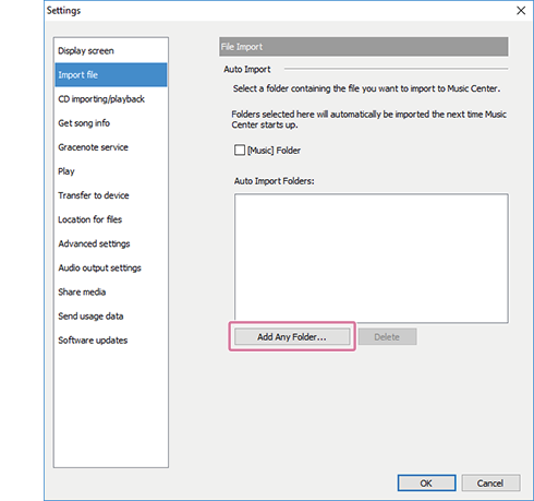 Wenn Sie bestimmte Bibliotheken beim ersten Starten von „Music Center for PC“ nicht importieren können, importieren Sie diese durch die Angabe des Speicherorts.