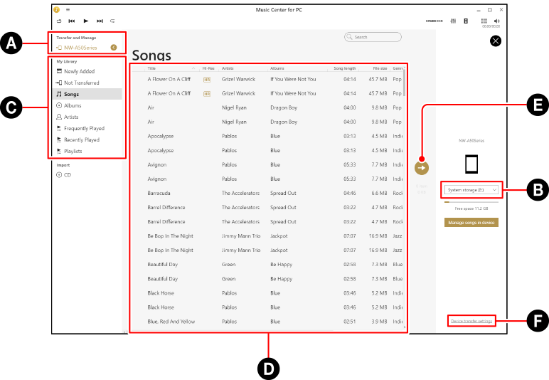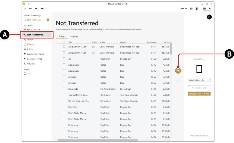 Sie können Songs von „Music Center for PC“ auf ein Audiogerät (z. B. Walkman) übertragen.