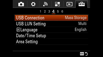 Conformément aux instructions de Lens System Software Updater (programme de mise à jour du logiciel système de l'objectif), sélectionnez [Menu] → [Setup] (Configuration) → [USB Connection] (Connexion USB) sur l'appareil photo, et vérifiez si [Mass storage] (Stockage de masse) est sélectionné. (Si vous utilisez la série QX, cette étape n'est pas nécessaire.) Si un autre mode que [Mass storage] (Stockage de masse) est sélectionné, veuillez sélectionner [Mass storage].