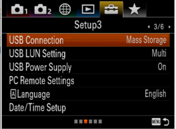- Suivez les instructions de la fenêtre System Software Updater. Sélectionnez Menu --> Setup subpage [3] (Configuration sous-page [3]) --> USB Connection (Connexion USB) sur l'appareil photo. Vérifiez si Mass Storage (Stockage de masse) est sélectionné.