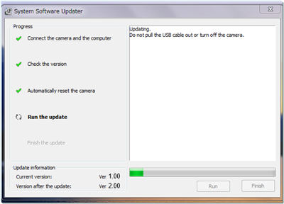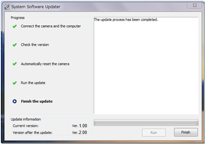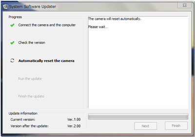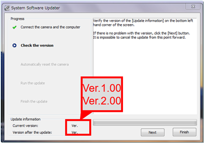 - Après avoir vérifié l'écran LCD de l'appareil photo, cliquez sur [Next] (Suivant). La version actuelle et la mise à jour apparaissent dans le coin inférieur gauche de l'écran. Après avoir confirmé que la version actuelle du logiciel est « Ver. 1.00 ou antérieure », cliquez sur Next (Suivant). Si la version actuelle du logiciel système est 2.00 ou ultérieure, aucune mise à jour n'est nécessaire. Dans ce cas, interrompez la connexion USB et cliquez sur [Finish] (Terminer). Eteignez l'appareil photo, retirez la batterie et/ou l'adaptateur secteur, réinsérez la batterie ou rebranchez l'adaptateur secteur, puis allumez l'appareil photo.