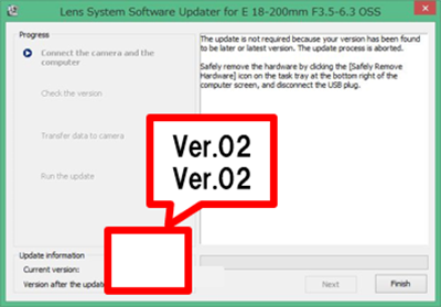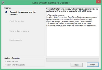 - Cliquez sur Next (Suivant) dans le programme de mise à jour du logiciel système de l'objectif. La version actuelle et celle de la mise à jour apparaissent dans le coin inférieur gauche de l'écran. Si la version actuelle du logiciel système de l'objectif est la version 03, aucune mise à jour n'est nécessaire. Dans ce cas, désactivez la connexion USB, puis cliquez sur Finish (Terminer). Éteignez ensuite l'appareil photo/la caméra, puis retirez le kit batterie et/ou débranchez l'adaptateur secteur. Réintroduisez la batterie ou rebranchez l'adaptateur secteur, puis rallumez l'appareil.