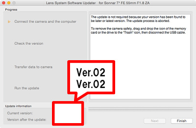 - Cliquez sur Next (Suivant) dans la fenêtre de mise à jour logicielle de l'objectif. La version actuelle et la mise à jour apparaissent dans le coin inférieur gauche de l'écran. Si la version actuelle est la version .02 ou une version ultérieure, la mise à jour n'est pas nécessaire. Dans ce cas, désactivez la connexion USB, puis cliquez sur Finish (Terminer). Eteignez ensuite l'appareil photo, puis retirez la batterie et/ou débranchez l'adaptateur secteur. Réintroduisez la batterie ou rebranchez l'adaptateur secteur, puis rallumez l'appareil photo.